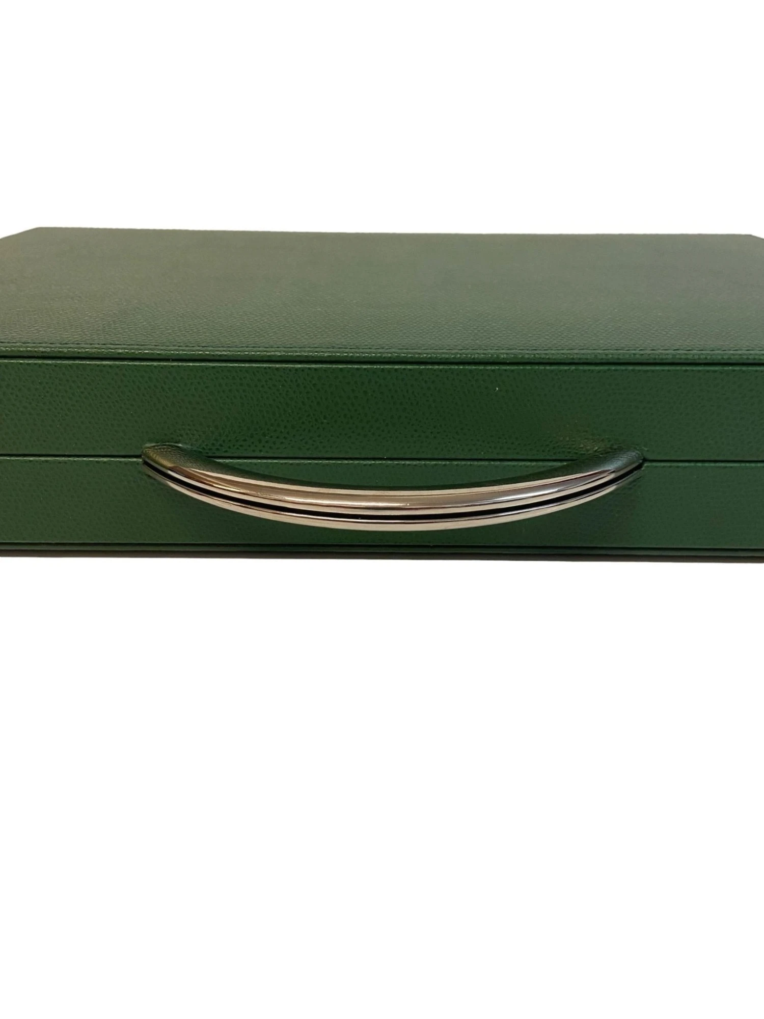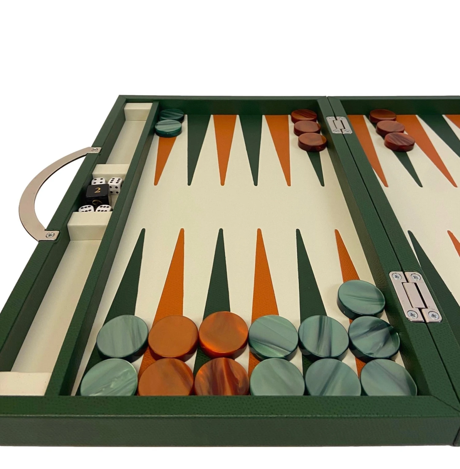 Backgammon Romagnoli en cuir grainé buffle vert, intérieur en marqueterie de cuir.