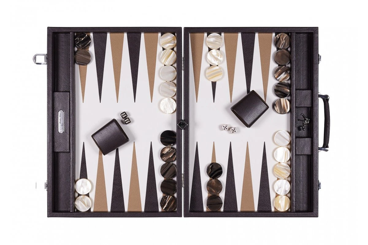 Le backgammon gainé de cuir tressé, avec son intérieur en marqueterie de cuir et ses fermoirs en acier, incarne l’essence du luxe et de l’exclusivité.