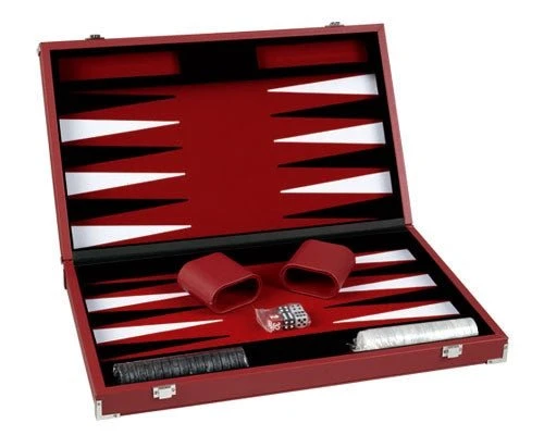 Backgammon en simili cuir, coins en métal, fonds en marqueterie de velours synthétique.