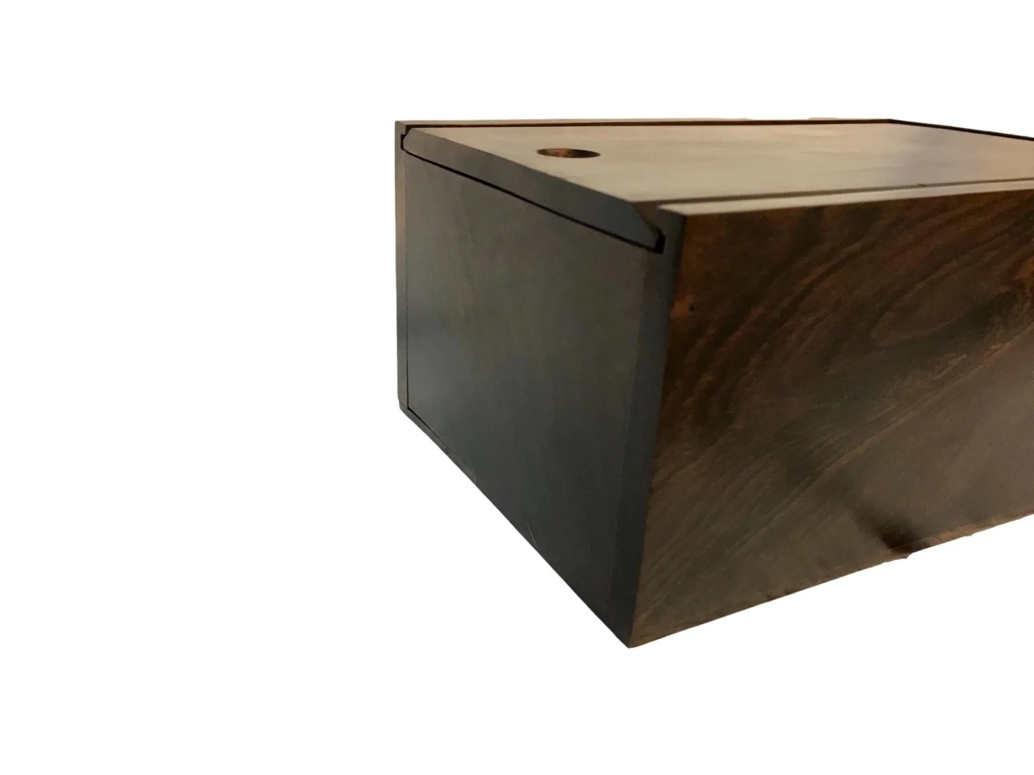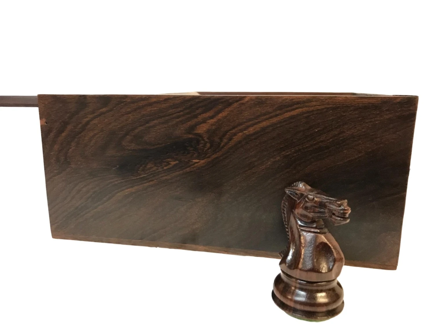 Boite de rangement en palissandre pour pièces d’échecs, avec couvercle à glissière biseauté.