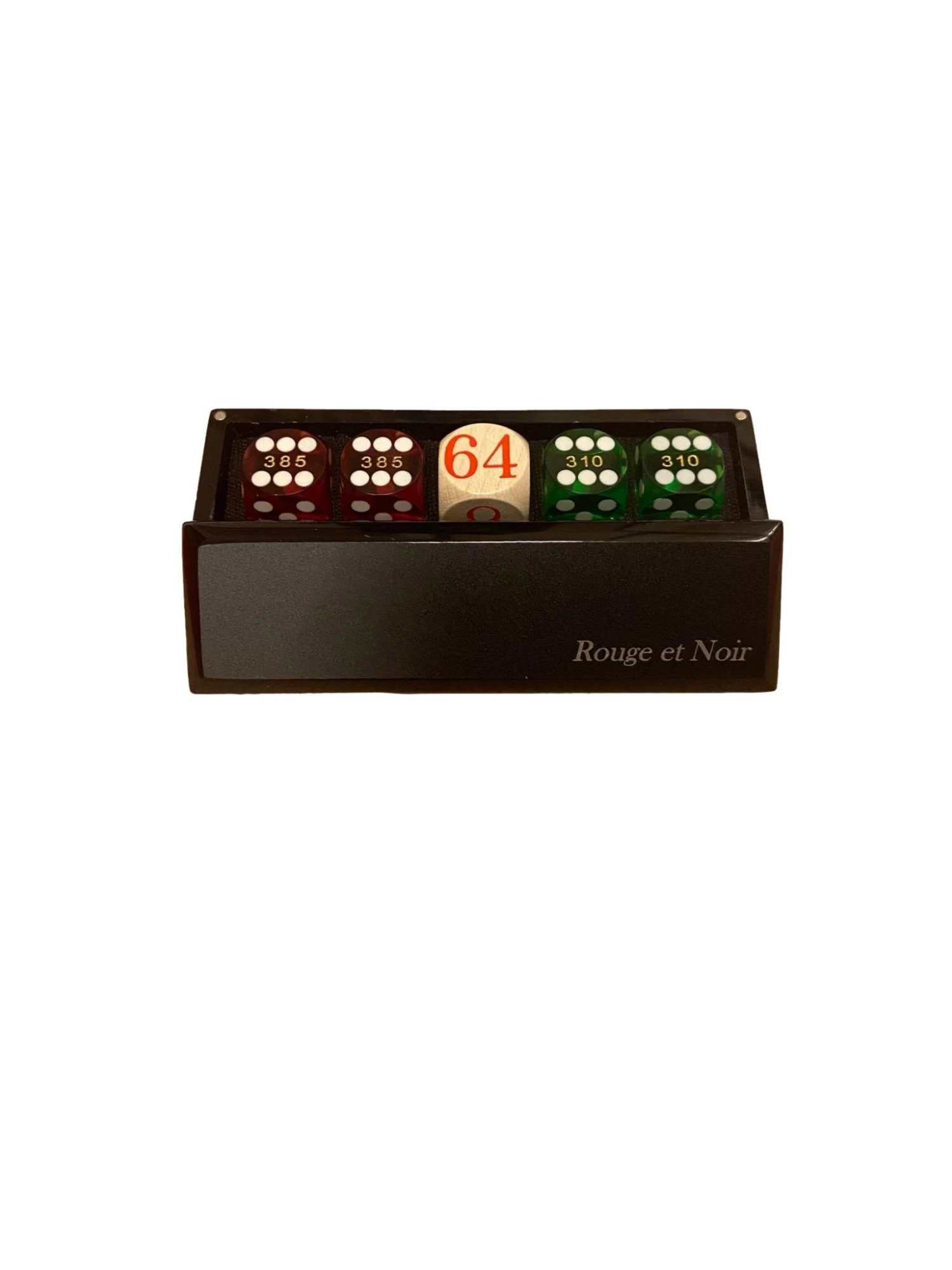 Coffret en bois à fermeture magnétique comprenant 2 paires de dés de précision calibrés et numérotées 14 mm et un videau en bois.