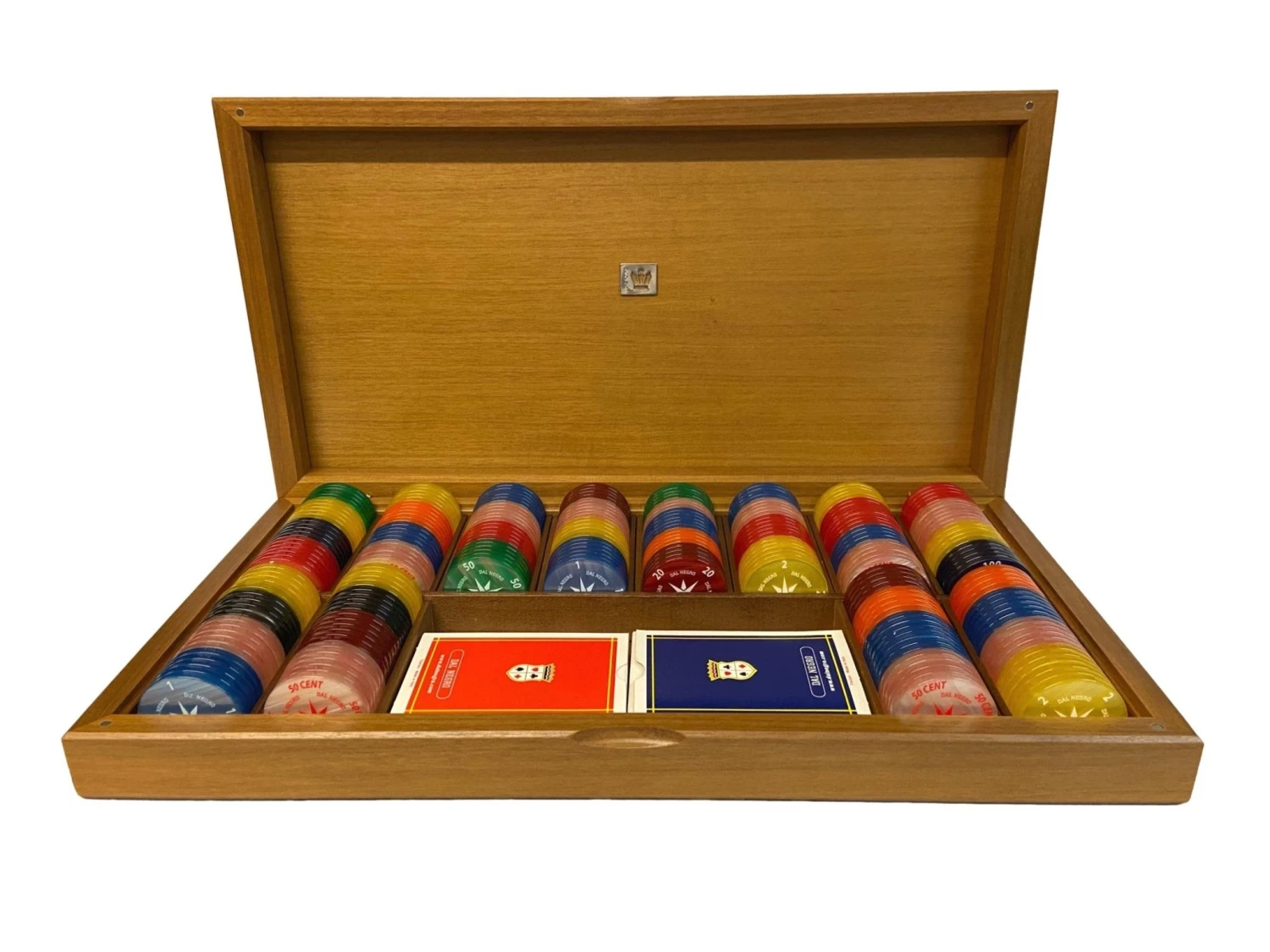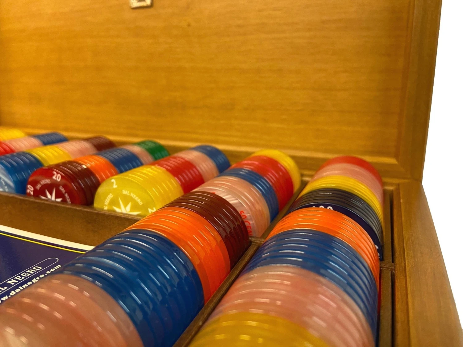 Coffret de poker composé de 250 jetons italiens nacrés à l’ancienne.