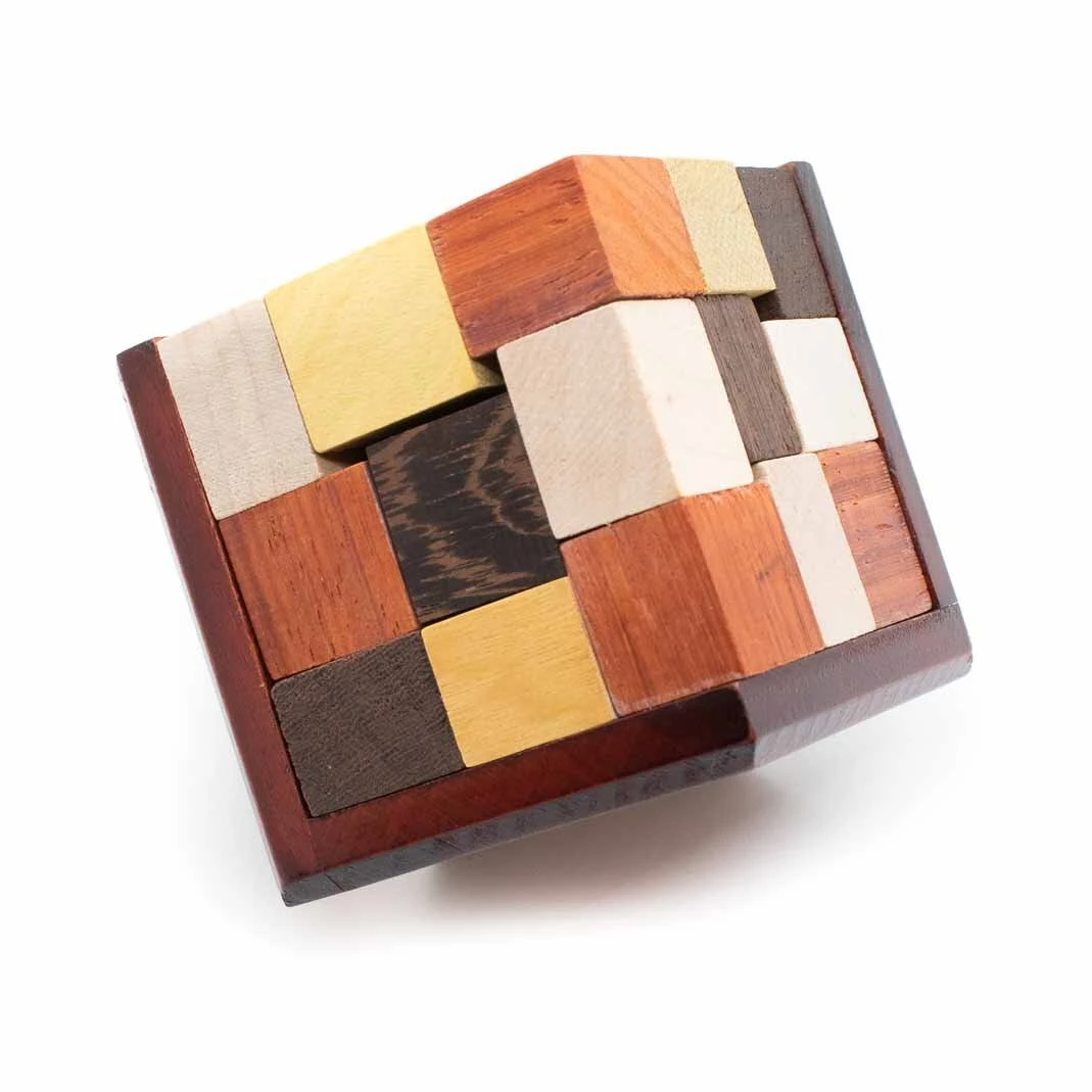 Casse-tête en 3D camposé de pièces en bois précieux, wengé, amaranthe, padouk…et d’un cadre de rangement à pan coupé pour une belle présentation.