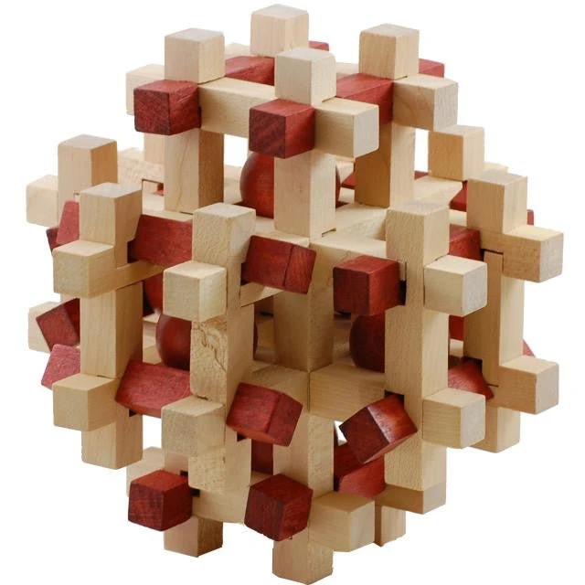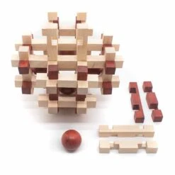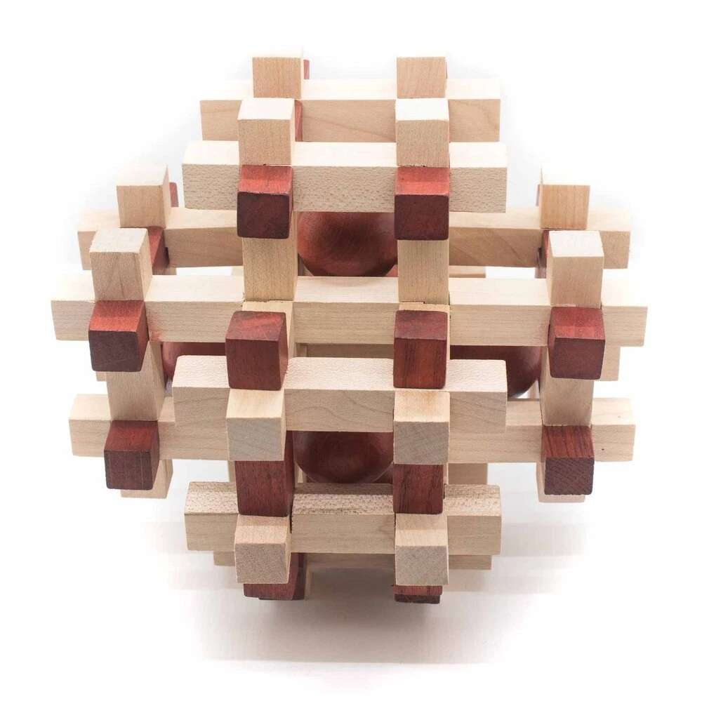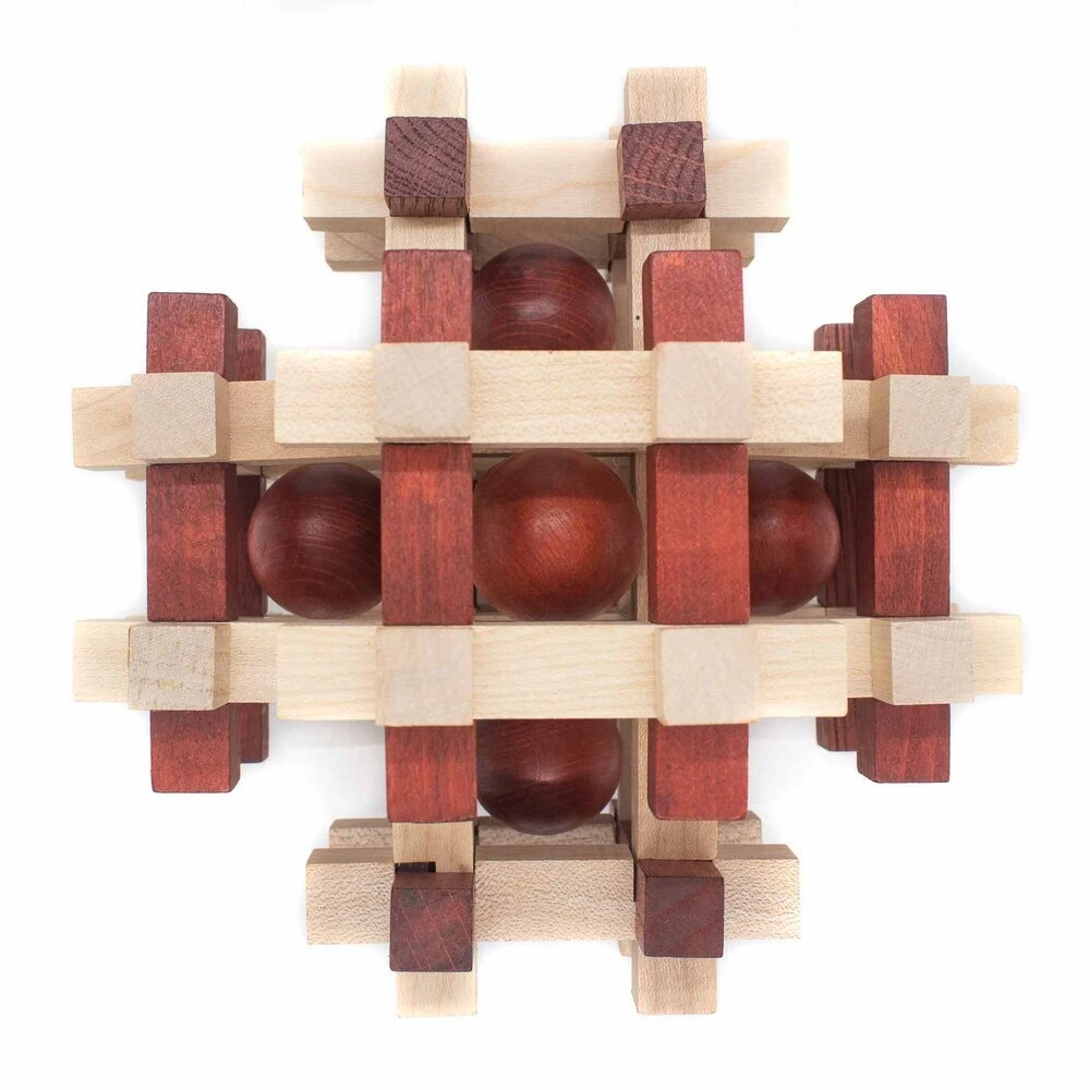 Défaire et refaire le casse-tête qui emprisonne les 6 boules de bois.