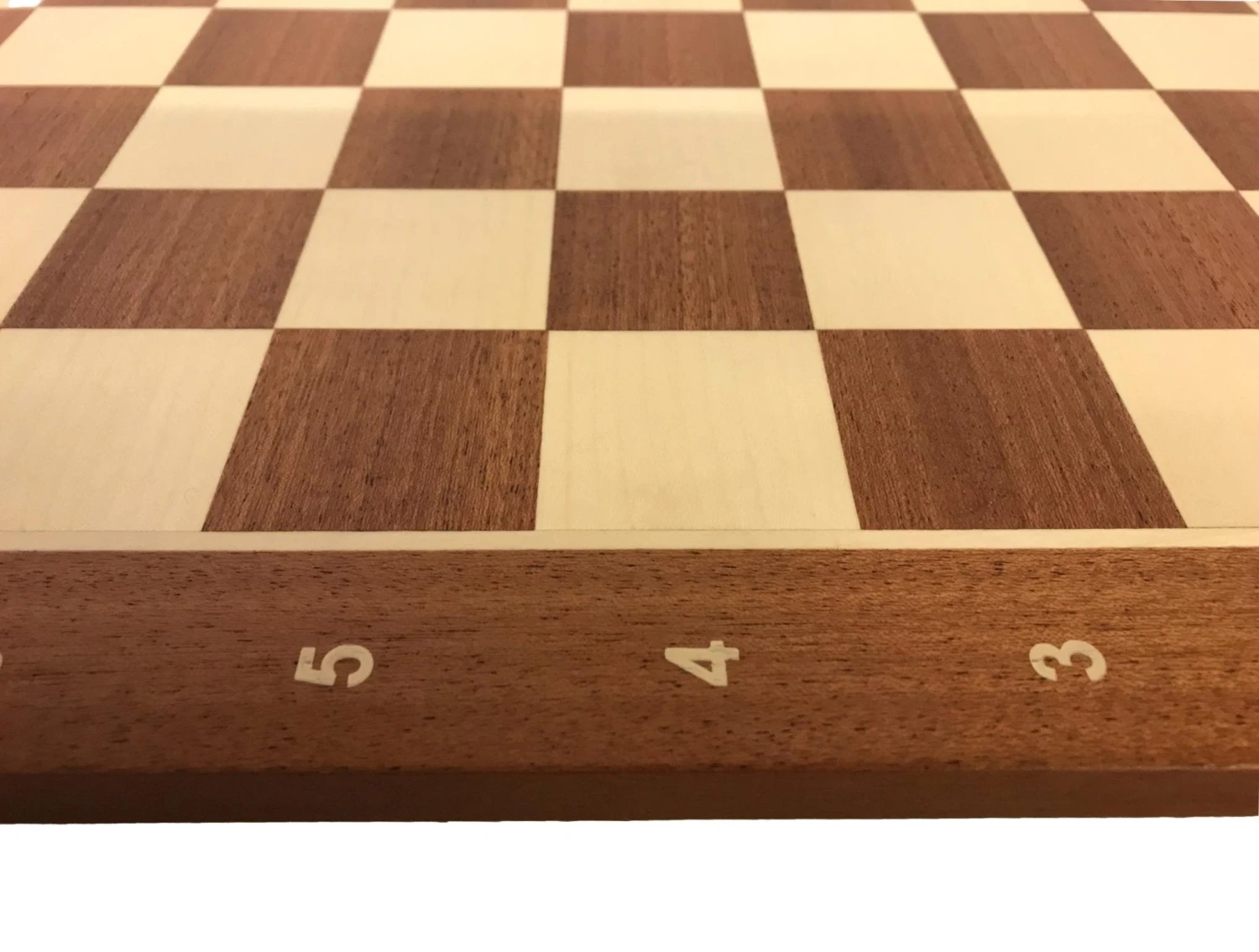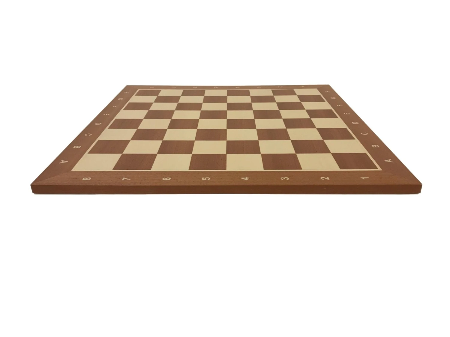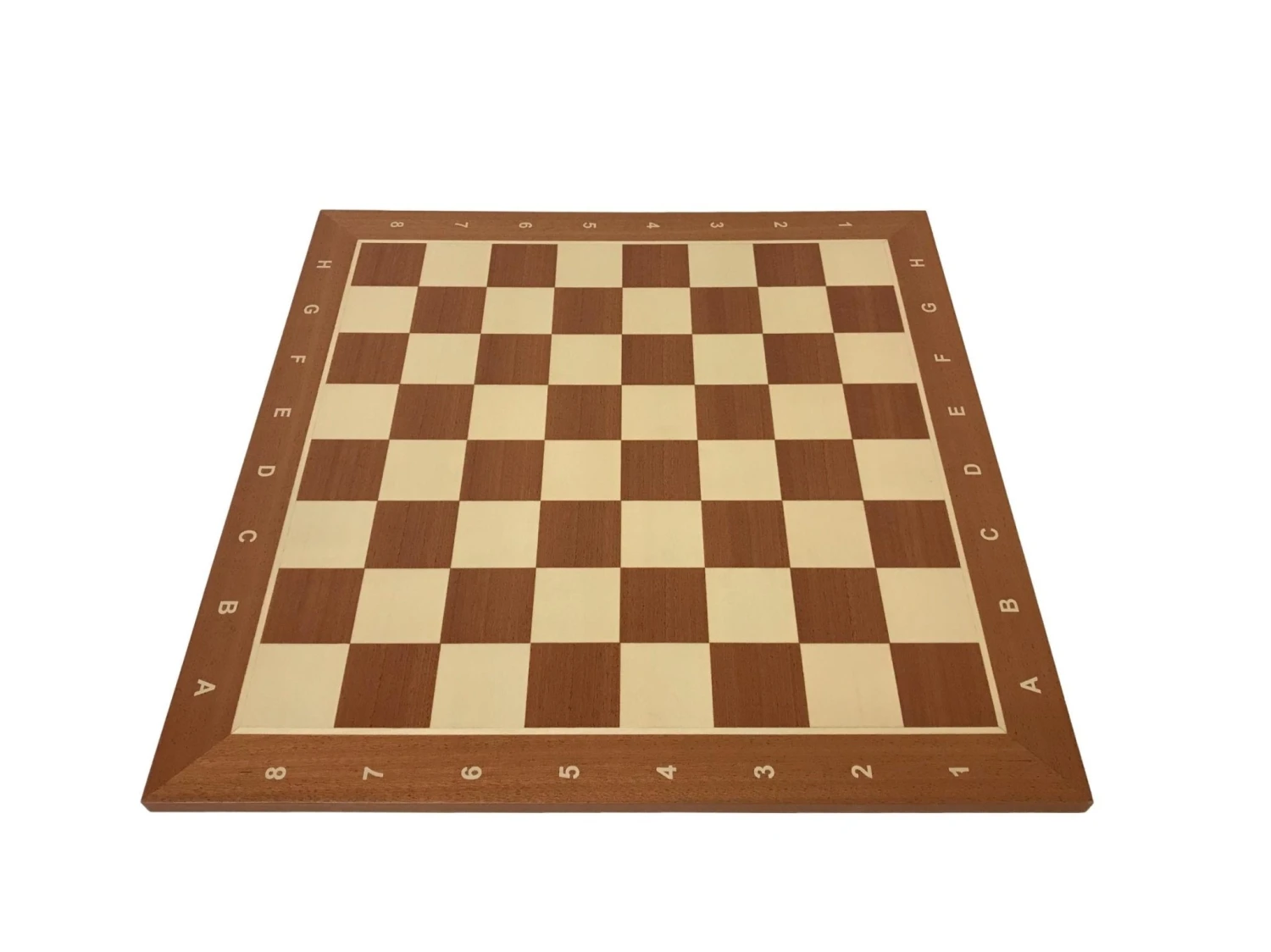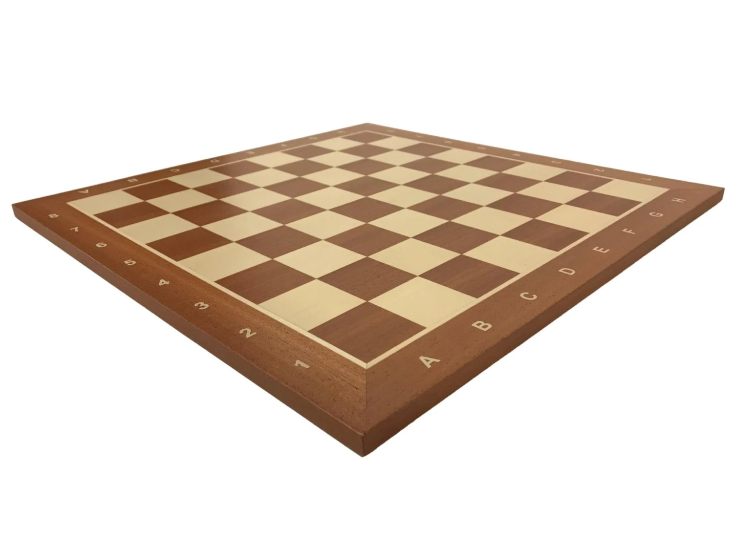 Echiquier de tournoi, en marqueterie d’acajou et de sycomore avec liseré ornemental, bords fins et coordonnées marquetées.
