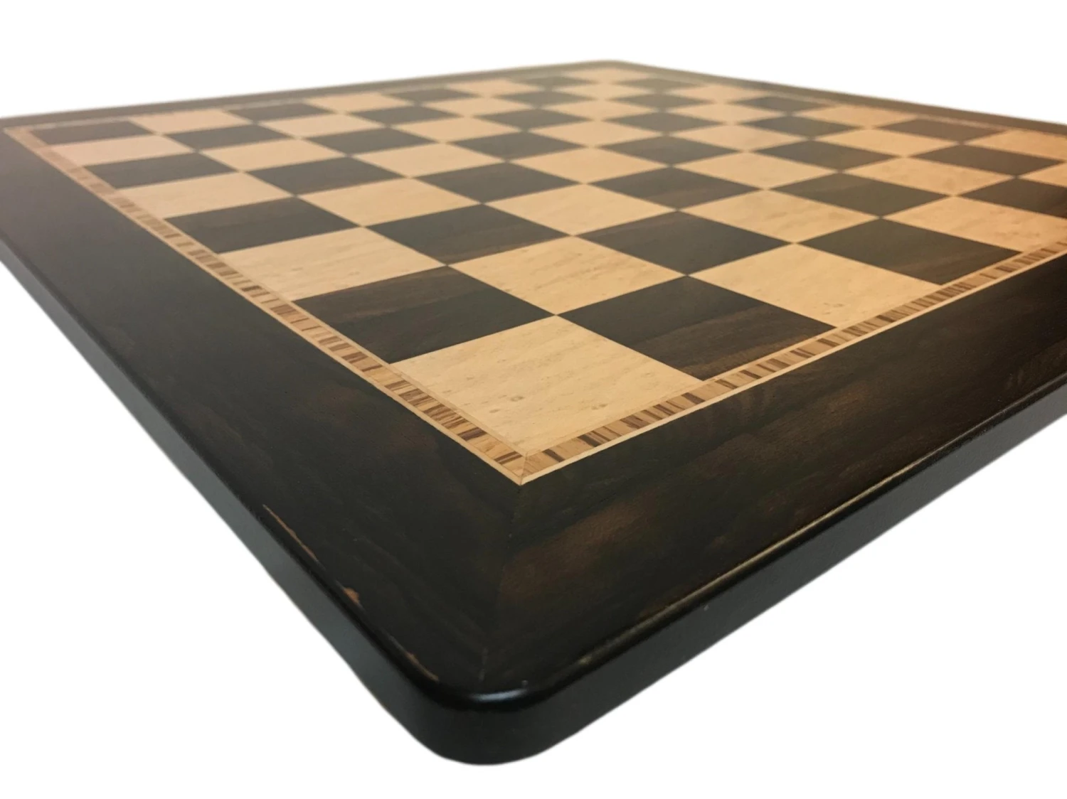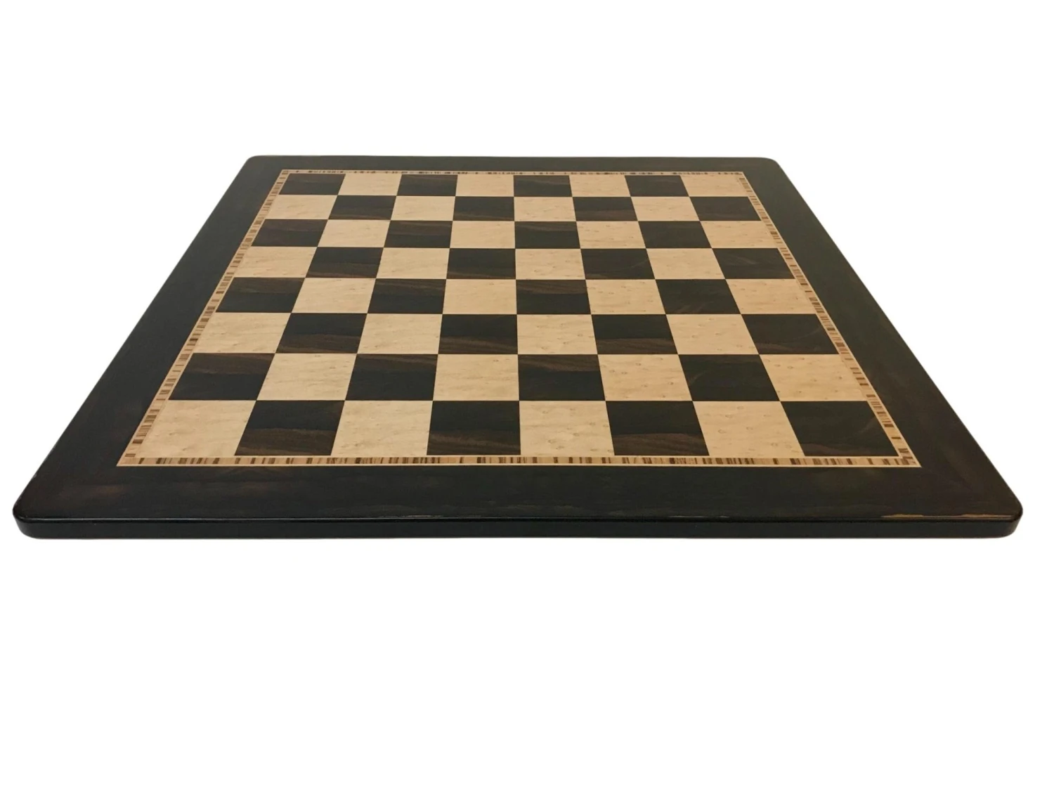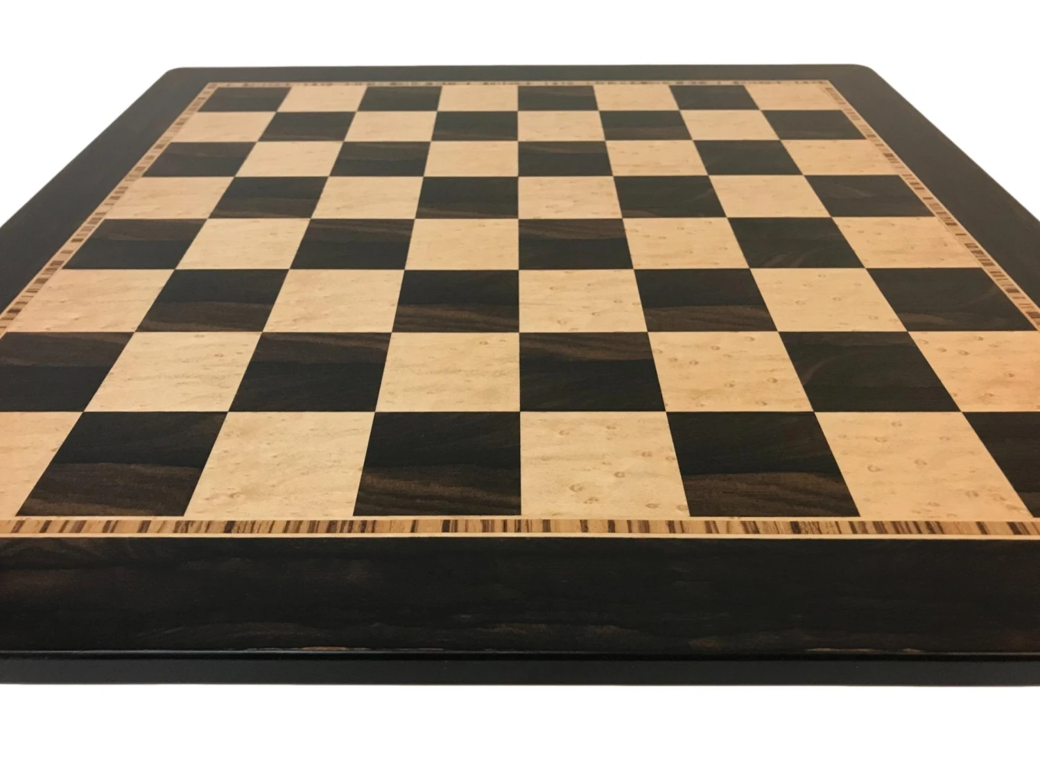 Echiquier en marqueterie de Ziricote et d’érable moucheté, avec liseré décoratif marqueté et bords arrondis.