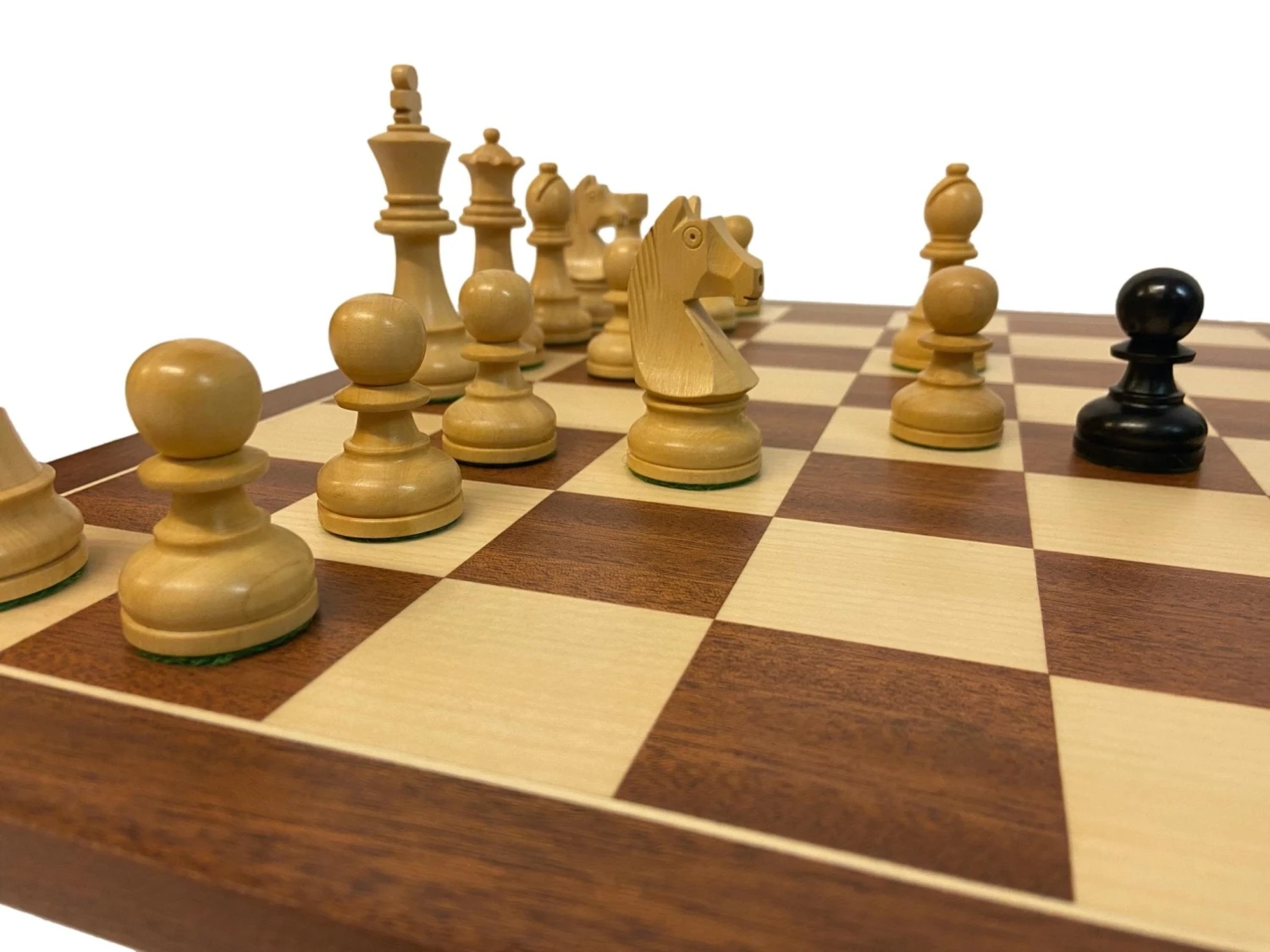 Les pièces noires tranchent avec le noyer des cases de l’échiquier, bois sobre et grisé, permettant une vision efficace de la position.