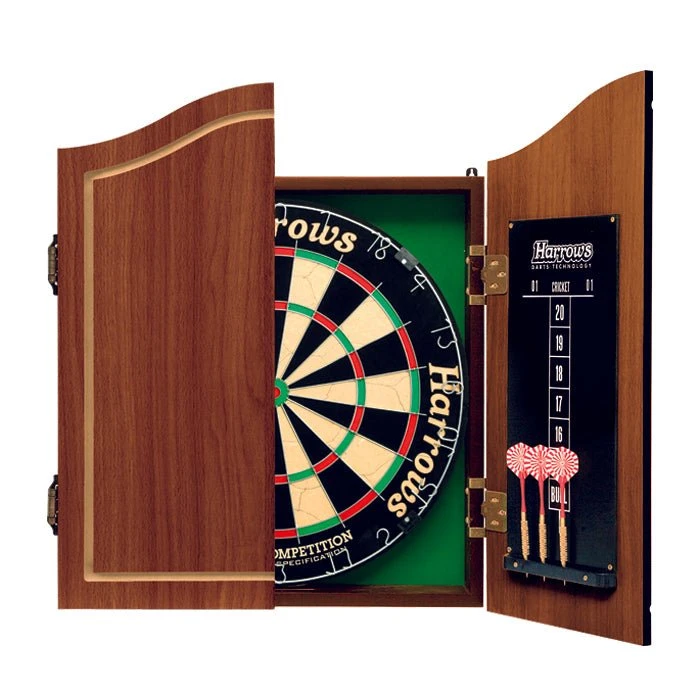 Ensemble de fléchettes Harrows comprenant une armoire en bois couleur chêne, une cible de fléchettes officielle Harrows et 2 jeux de 3 fléchettes acier.