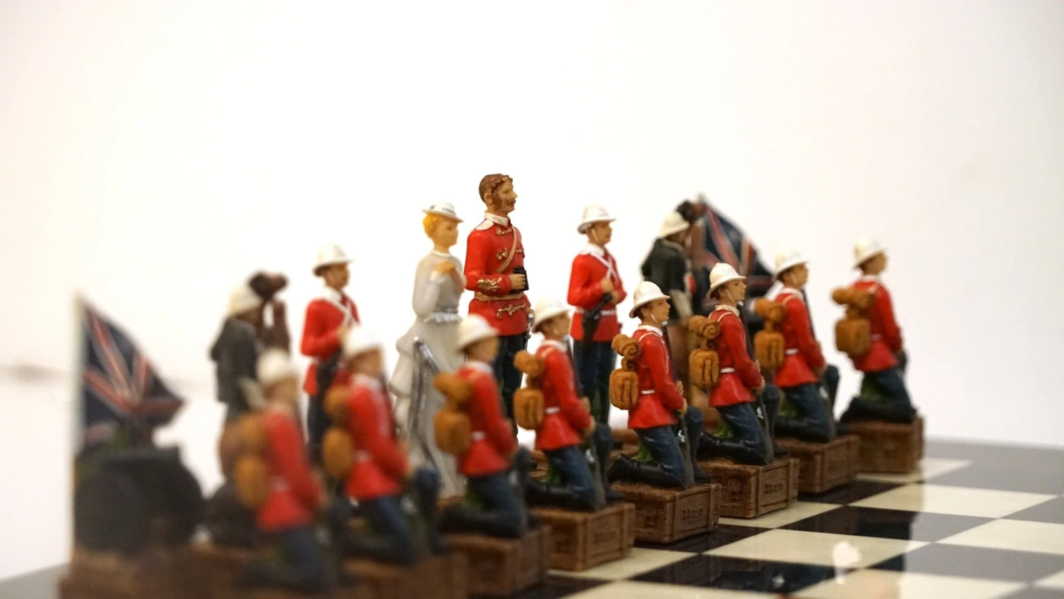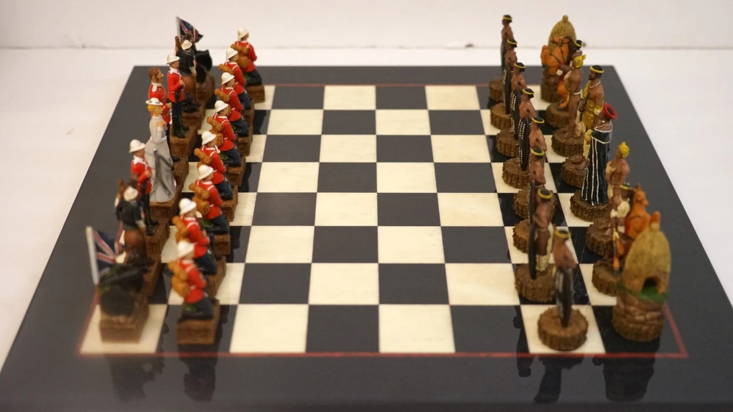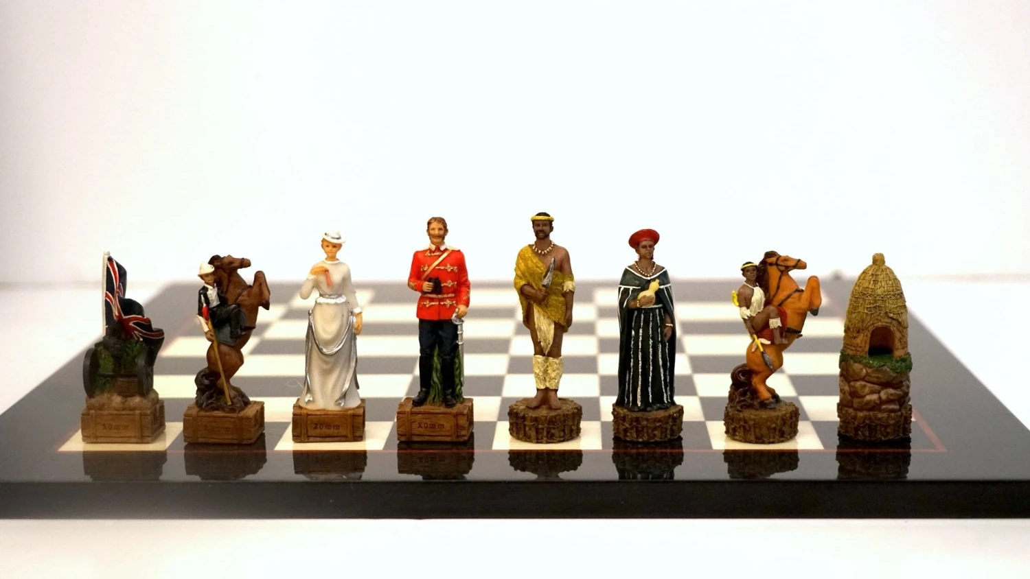 Magnifique ensemble comprenant un plateau en bois teinté et laqué, ainsi que des pièces en résine, peintes à la main faisant s’affronter les pirates et la marine !