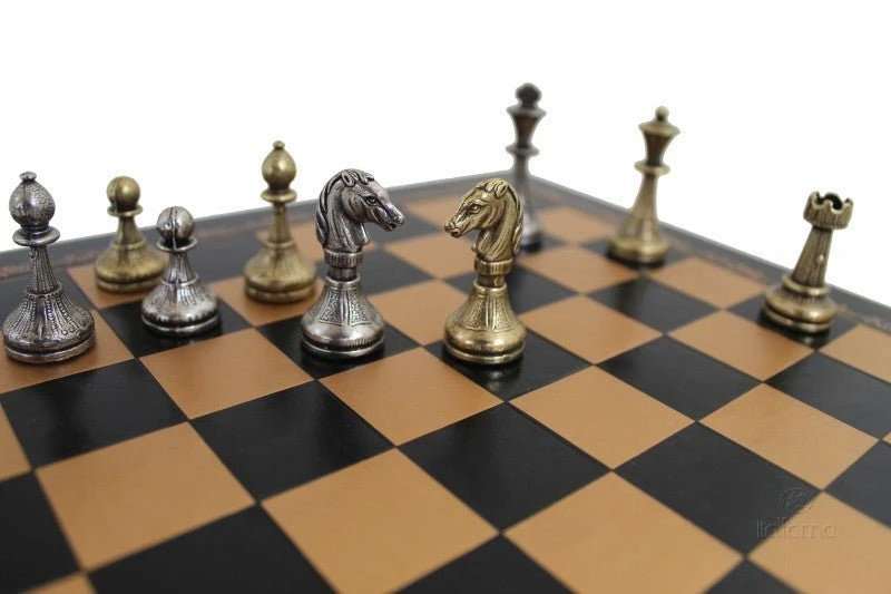 Très joli ensemble de petite taille, constitué des petites pièces en métal doré et argenté de style Staunton et d’un échiquier en Salpa (croûte de cuir agglomérée).