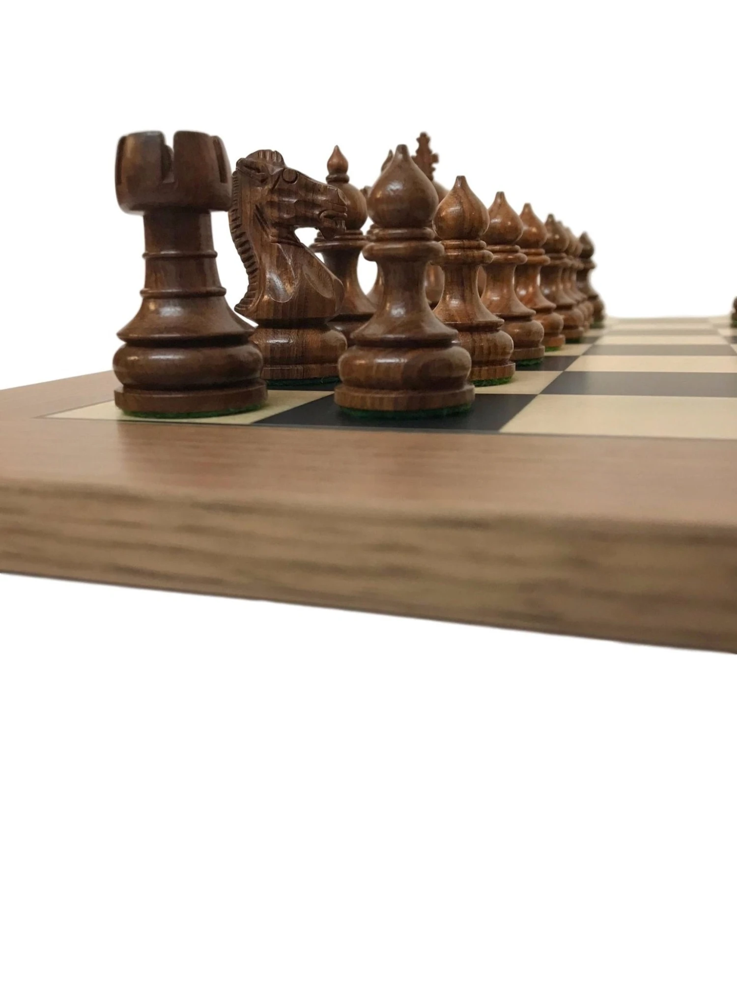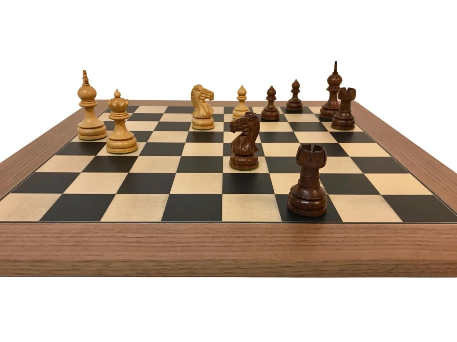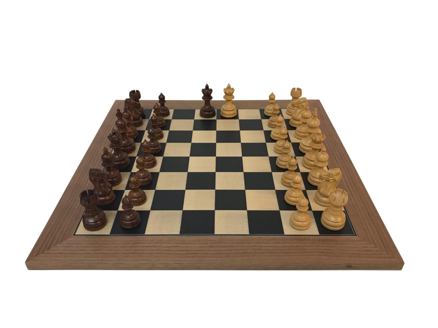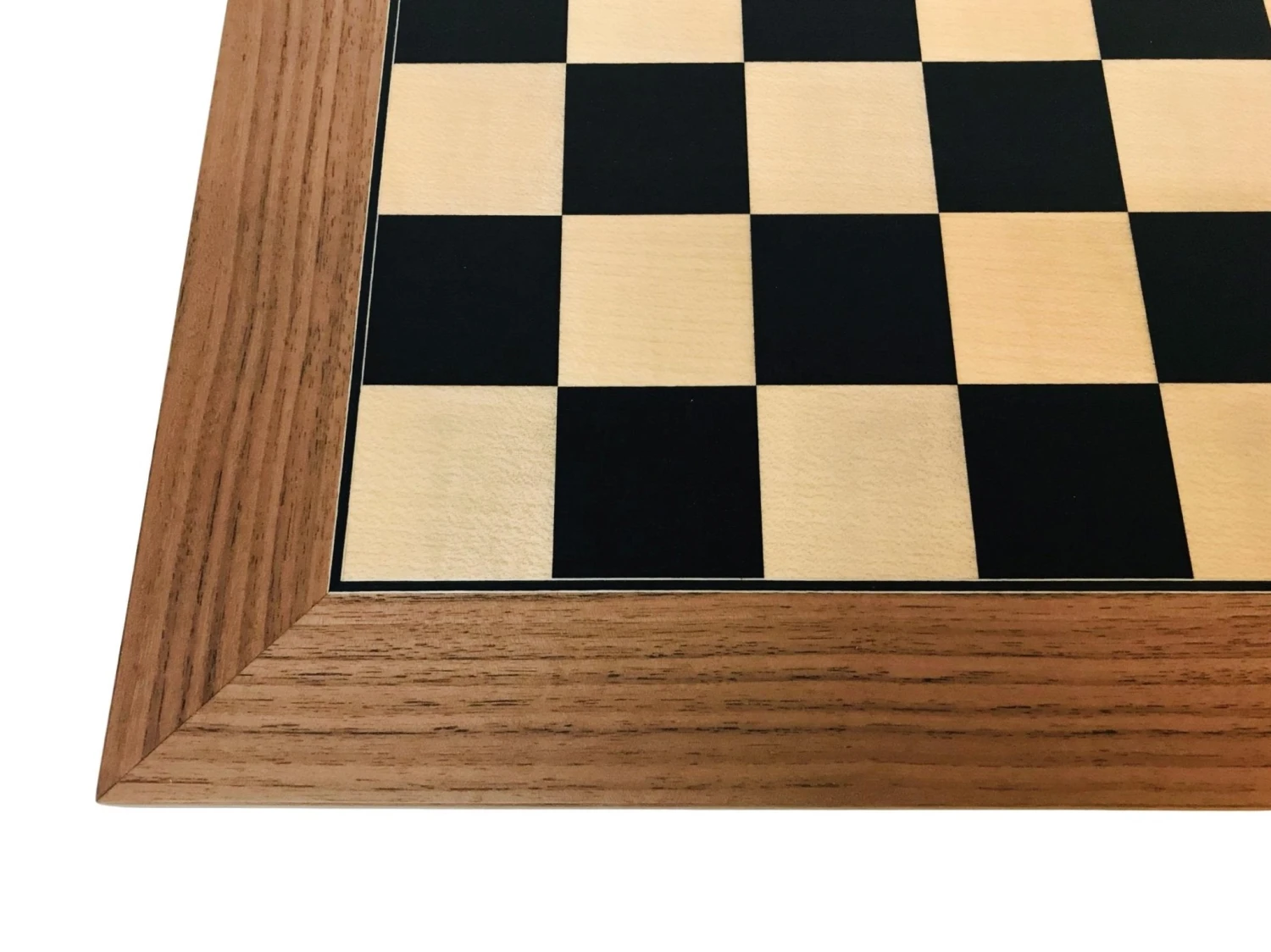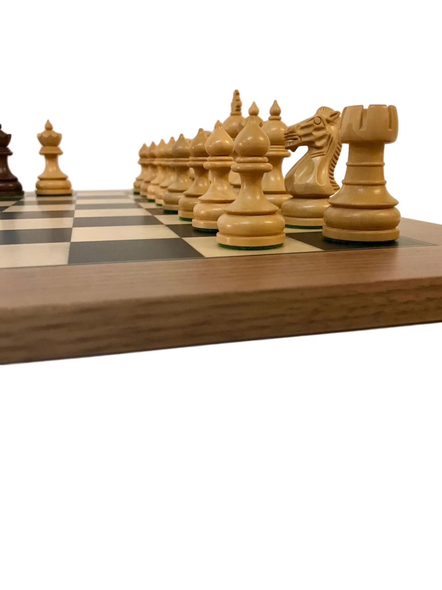 Le bord en noyer rappelle la douceur des pièces, et les cases en sycomore et poirier teinté noir, au contraire, contrastent et offrent ainsi une impeccable vision du jeu.