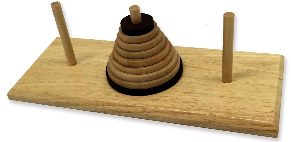 Grand classique des casse-têtes, la tour de Hanoï consiste à faire passer la pyramide sur un autre bâton sans jamais poser un pion plus grand sur un plus petit.
