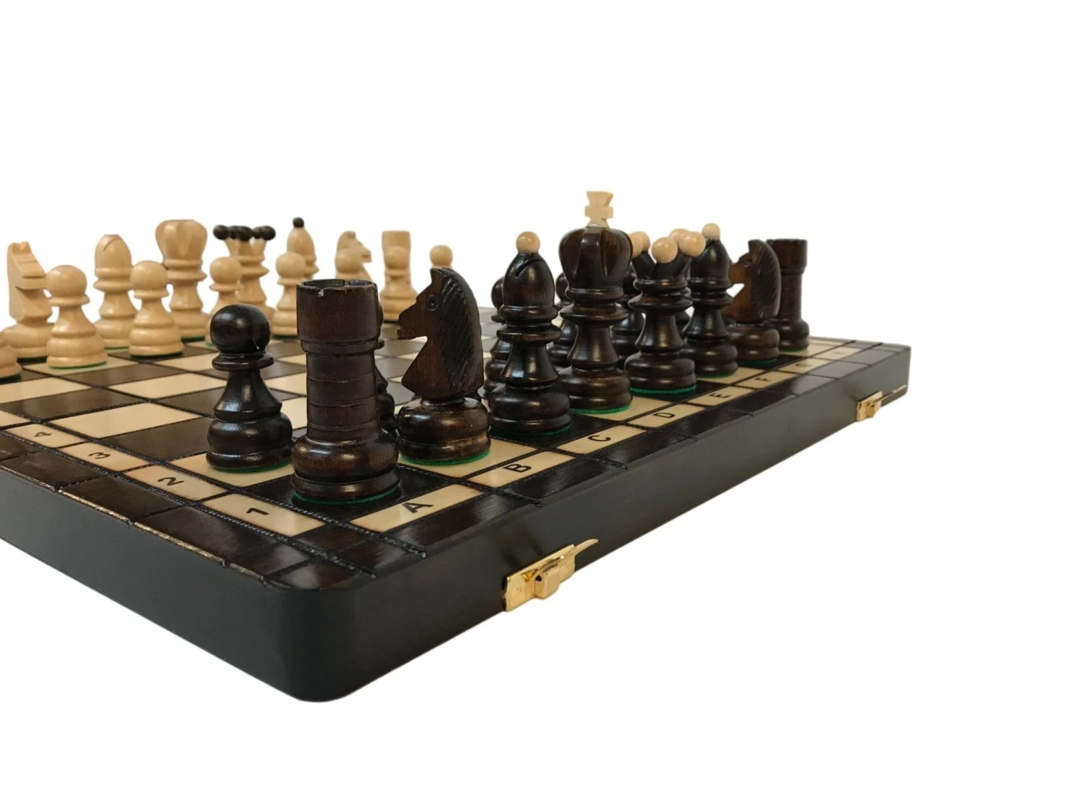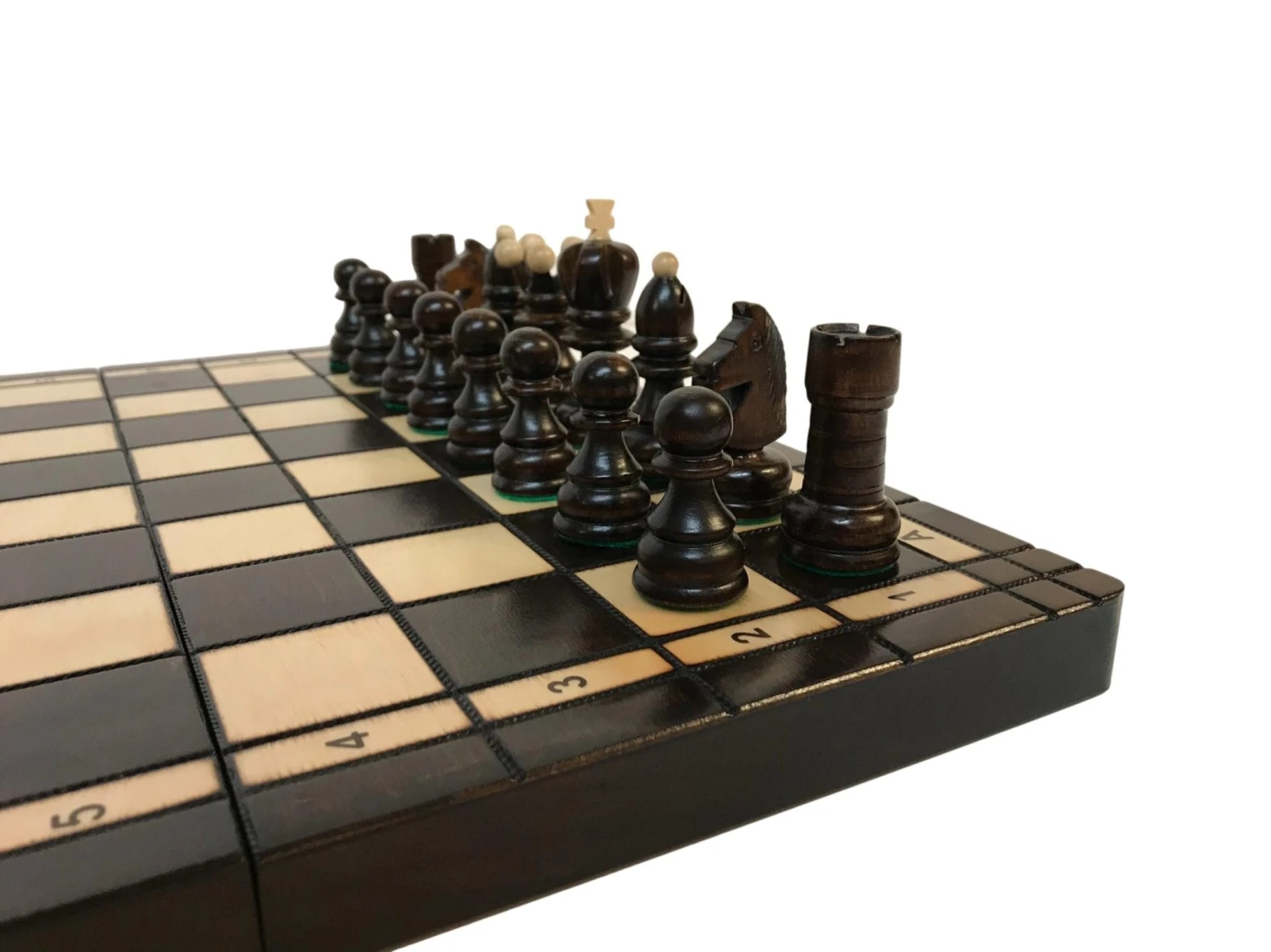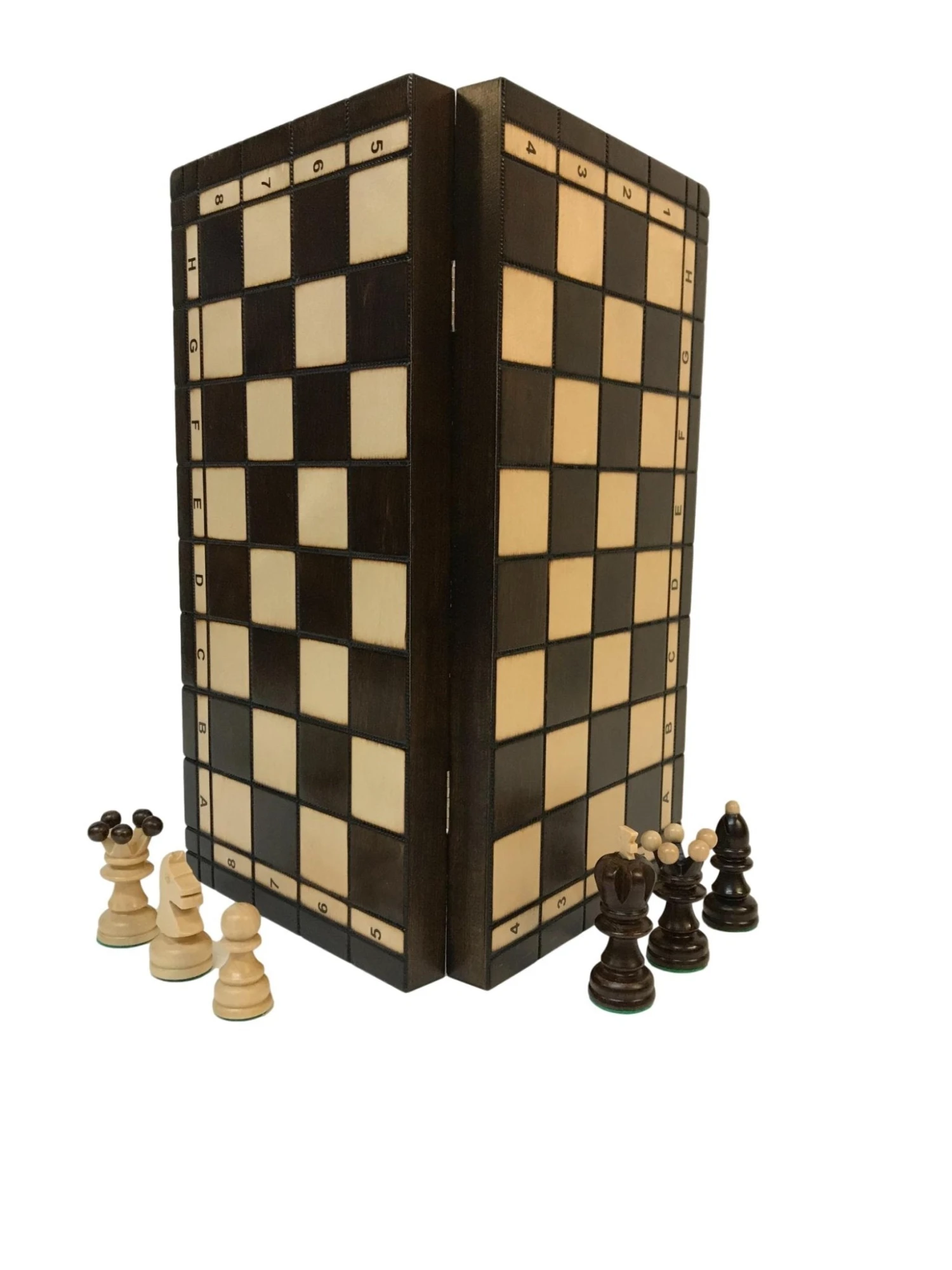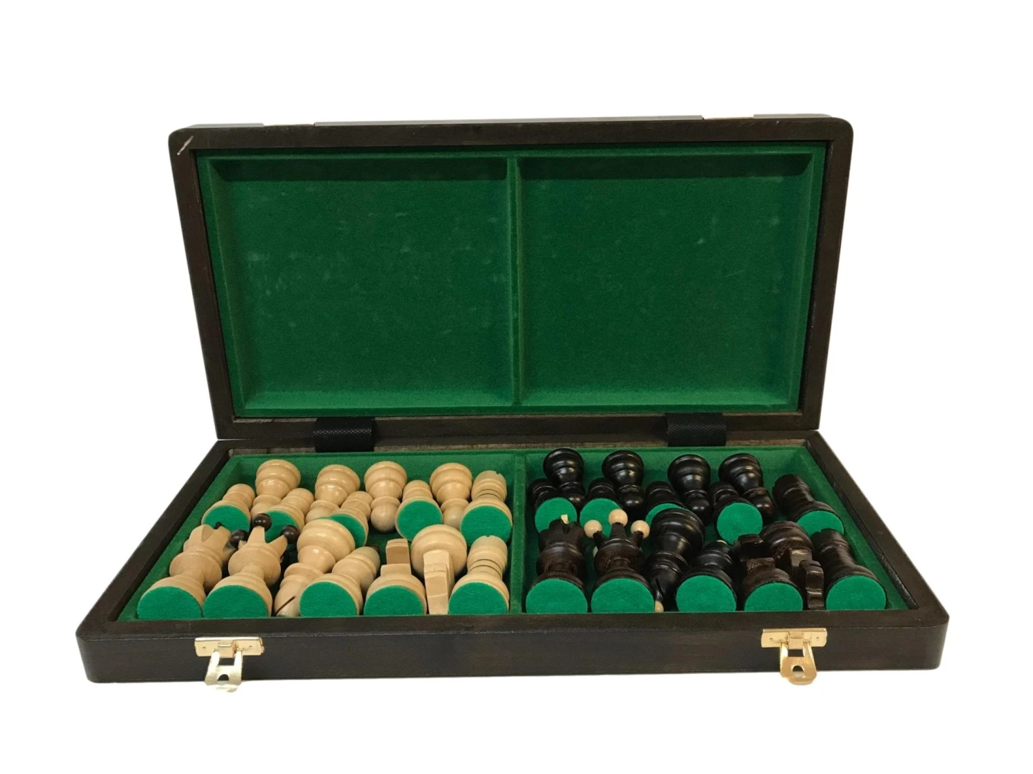 Jeu d’échecs en coffret pliant avec les pièces rangées à l’intérieur.