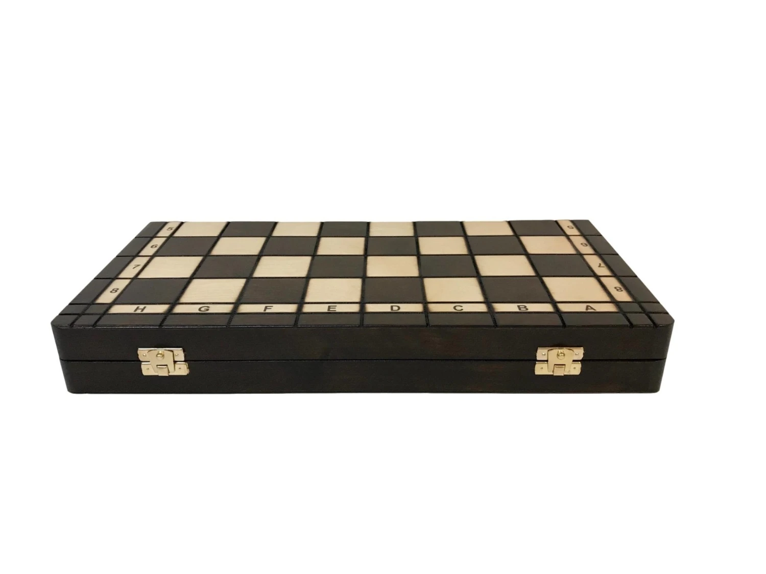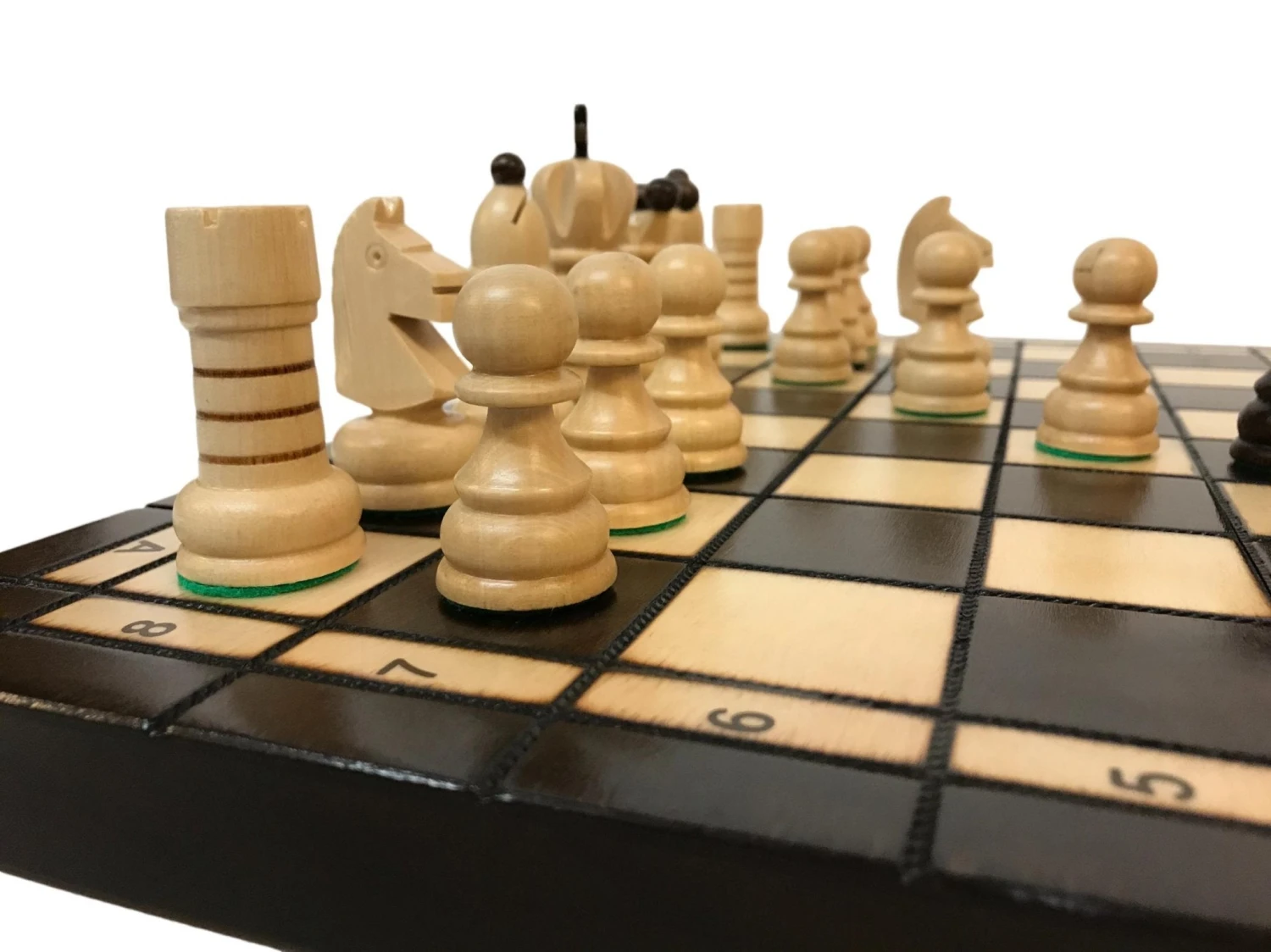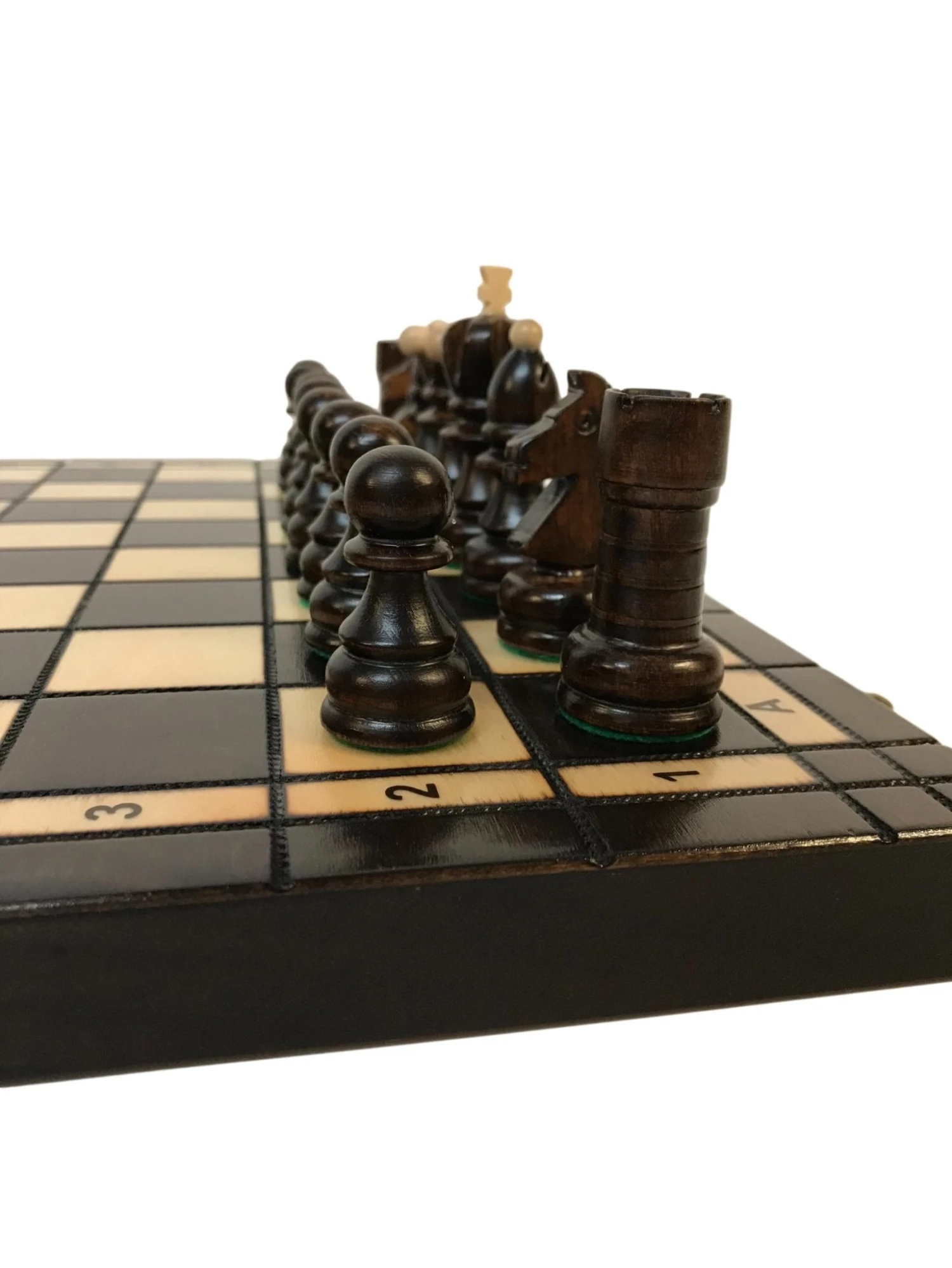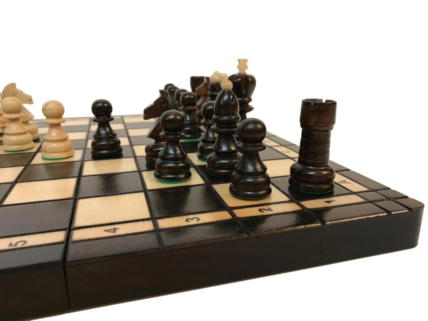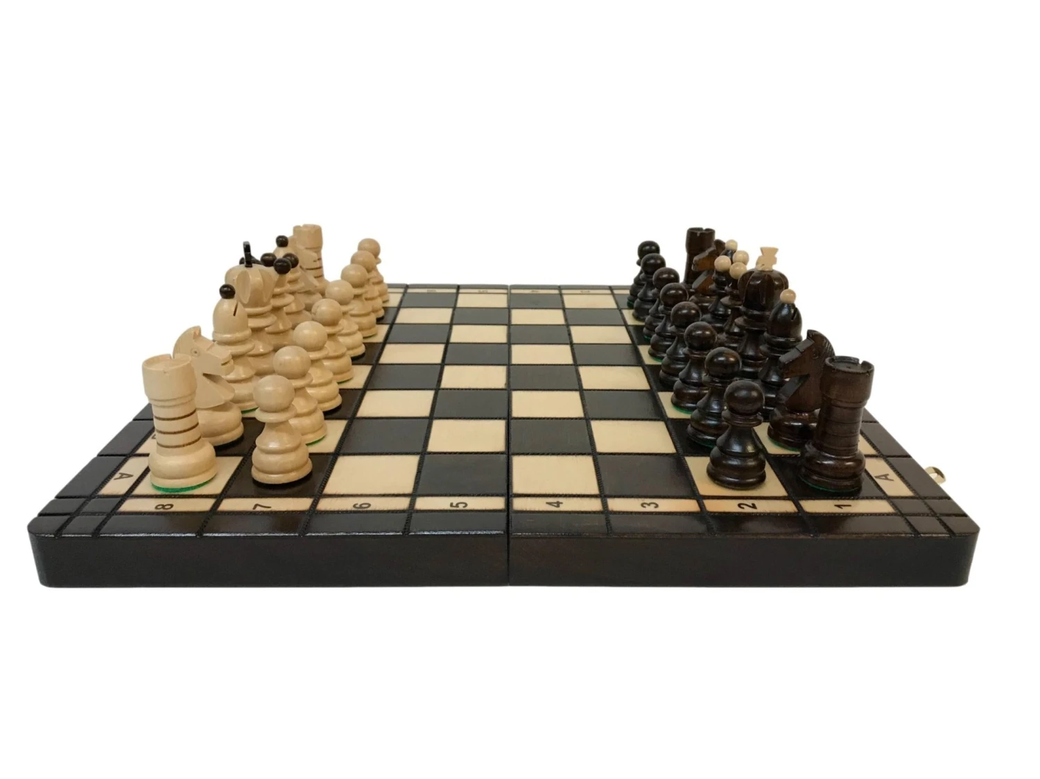 Jeu d’échecs en coffret pliant avec les pièces rangées à l’intérieur.