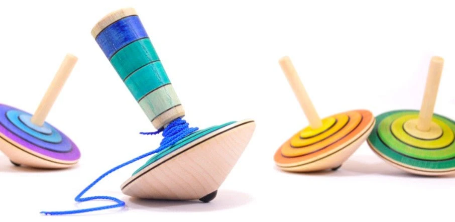 Toupie à bouton en bois d’érable tournée à la main et peinte en camaïeux de couleurs élégantes.