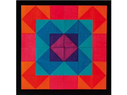 Three different mosaic cubes form the basis of this firework of colors. As no two surfaces are alike, eighteen distinct colors are visible, six of which are separated diagonally into two color tones. This subtle form in combination with a clarity and pureness of the colors, incite the player to create countless new variations.