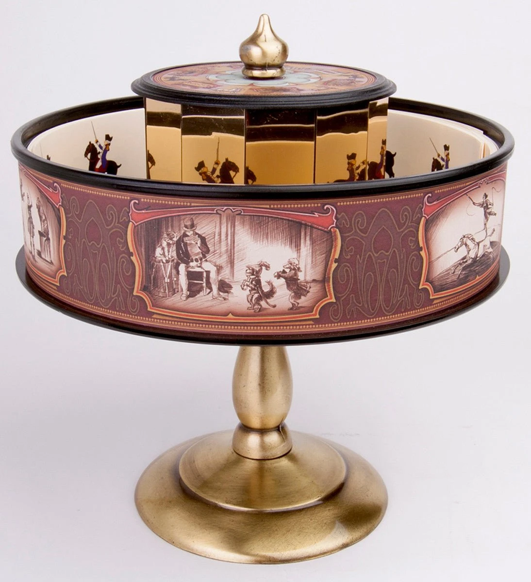 Le Praxinoscope a été inventé par Emile Reynaud en 1877. C’est une amélioration décisive sur le zootrope (dont le principe avait été inventé par Horner en 1834), car l’utilisation de miroirs permet la restitution du mouvement avec une continuité et une lumière sans égales.
