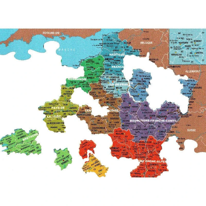 Ce puzzle est idéal pour apprendre ou se souvenir en s’amusant ! Grâce à la découpe qui suit les lignes de chaque département, et à leur couleur differenciée par région, on découvre la géographie de la France. La carte détaillée montre la plupart des villes de plus de 20000 habitants.