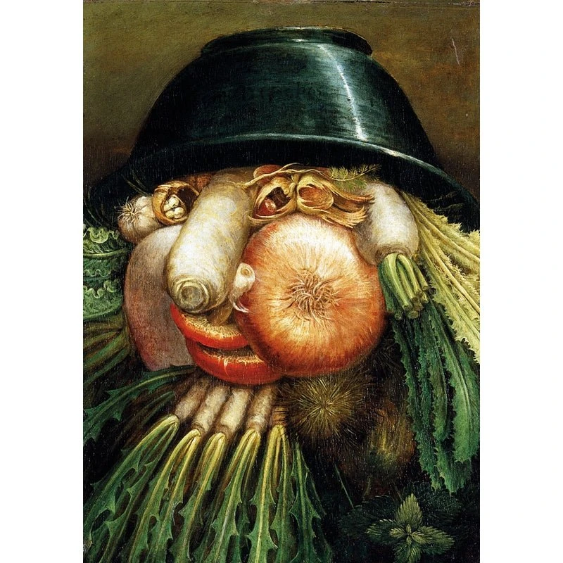 Arcimboldo est un peintre italien du XVIème siècle. Il est connu pour ses portraits réalisés à partir dassemblage dobjets. Par exemple, il fait le portrait dun bibliothécaire uniquement à partir de livres, ou celui de lEté à partir de fruits. Ce tableau représente un panier de légumes mais si on le retourne un homme apparaît !