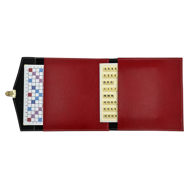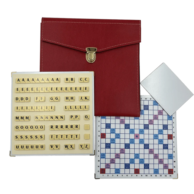 Il comprend un plateau de jeu magnétique de 22 cm de côté, un range-lettres alphabétique magnétique, ainsi que deux plaques « porte-lettres », le tout parfaitement rangé dans une pochette en cuir végan de la couleur de votre choix.