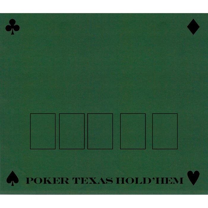 Tapis de poker en feutre vert, inscriptions et cartes du board en noir.