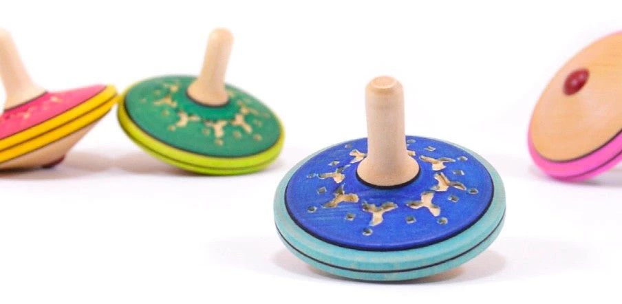 Facile à envoyer, cette toupie est décorées de motifs burlesques sculptés.